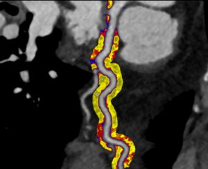 A CT coronary angiogram shows the coronary arteries and can identify plaque and narrowing. CaRi-Heart adds an additional layer by analysing changes in the tissue surrounding the coronary arteries that are associated with inflammatory activity. This is not something that can be reliably assessed by the human eye in routine reporting.